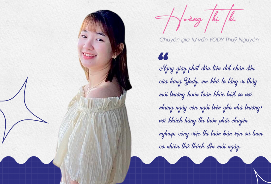 “YODY xin chào. Em là Thi, sinh năm 2000, hiện đang là Chuyên gia tư vấn tại cửa hàng YODY Thuỷ Nguyên. Em bén duyên với YODY từ năm 2018, đến nay cũng gắn bó gần 5 năm thanh xuân rồi.